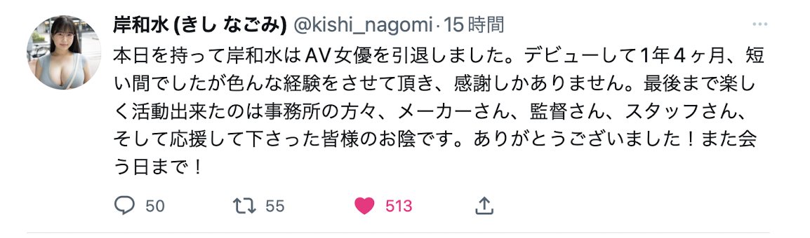 奋斗了一年四个月,巨乳女优「岸和水」宣布,即日起引退。