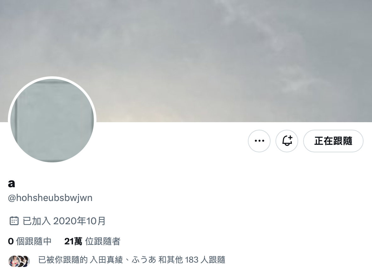 她把名字改成了「a」,帐号的ID也做了修改(https://twitter.com/hohsheubsbwjwn),然后把之前追踪的人都退了,发文也删光光,摆明了是要把帐号归零了⋯