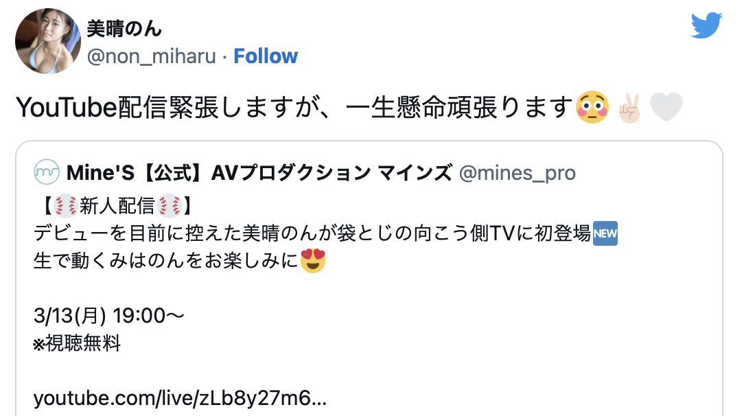 首先是3月8日,经纪公司和美晴のん(美晴暖)本人都发表了要在出道发售的前一天于YouTube直播的消息,美晴のん(美晴暖)还在转推的发文中提到说虽然自己很简单但会加油的;但到了活动当天(3/13),事务所却宣布因为「诸多因素」所以必须中止这一次的直播⋯