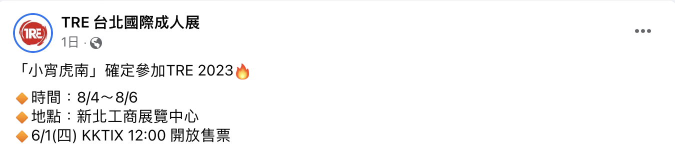 那假如你对这两位女优没兴趣,想知道TRE台北国际成人展的卖票资讯呢?这几天主办单位的官网、脸书粉丝团、官方twitter及IG都有释出消息,入场券以及金卡银卡都会在女优名单公布完毕后6月1日中午12点于KKTIX(https://kktix.com/)开卖,由于今年的阵容真的超级豪华,主办加摊位总共快50位女优,门票应该会一扫而空,所以要请大家务必准时抢时抢票惹: