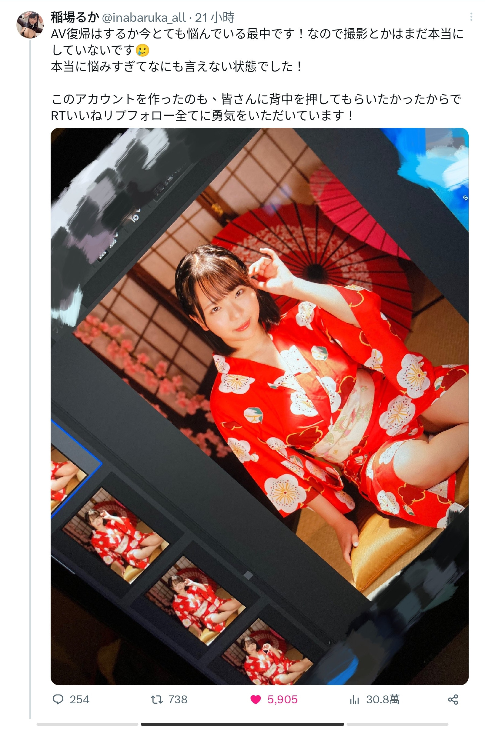 所以从字面上的意思来看稲场るか(稻场流歌)并没有「绝对不拍」,但到现在为止还没有下定决心重返战场;最后究竟会怎么样呢?我想只要再累积多一点粉丝每天有人夸她可爱说想看她拍片就没问题了,我非常乐观,她会复活的!