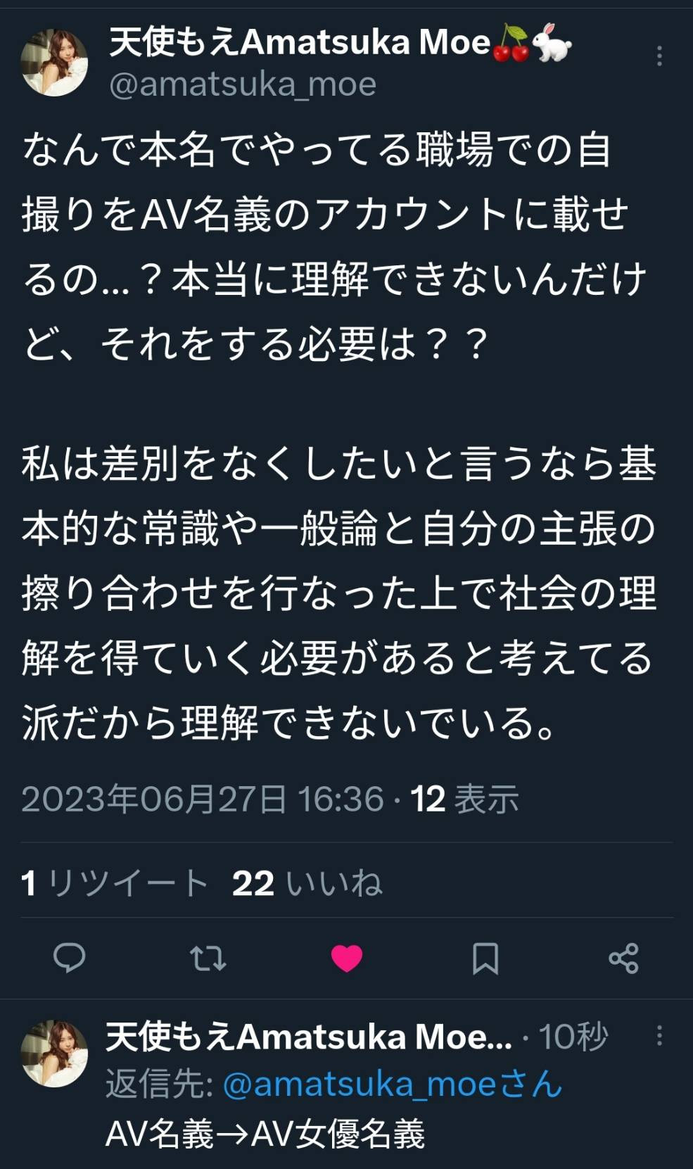 这么说吧,虽然以AV新法时的发言来看天使もえ(天使萌)应该是要力挺藤かんな(藤环奈)的工作权的,但在这事上她与反对新法时的战友月岛さくら(月岛樱)看法完全不同,她认为藤かんな(藤环奈)这种用AV女优的帐号曝光真实身分工作状况的做法十分不妥,感觉就像拜托人家把你认出来似的: