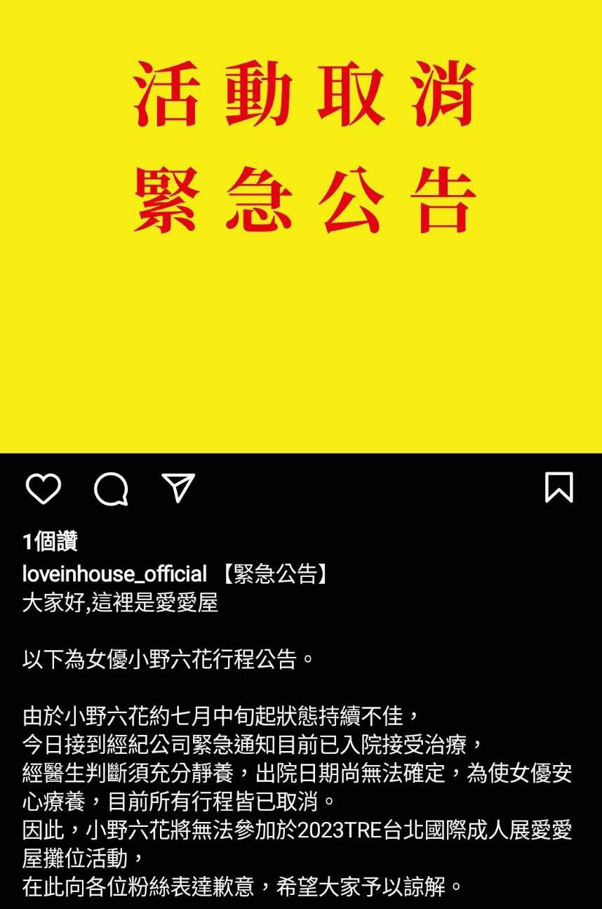 到底是什么事这么严重?让小野六花必须「取消」活动而不是延期?因为一般女优没有办法完成活动多半会选择延期再办,小野六花用取消的方式代表她本人及事务所都不认为短期内有办法回来,我猜很多人脑袋里都浮现两个字ー