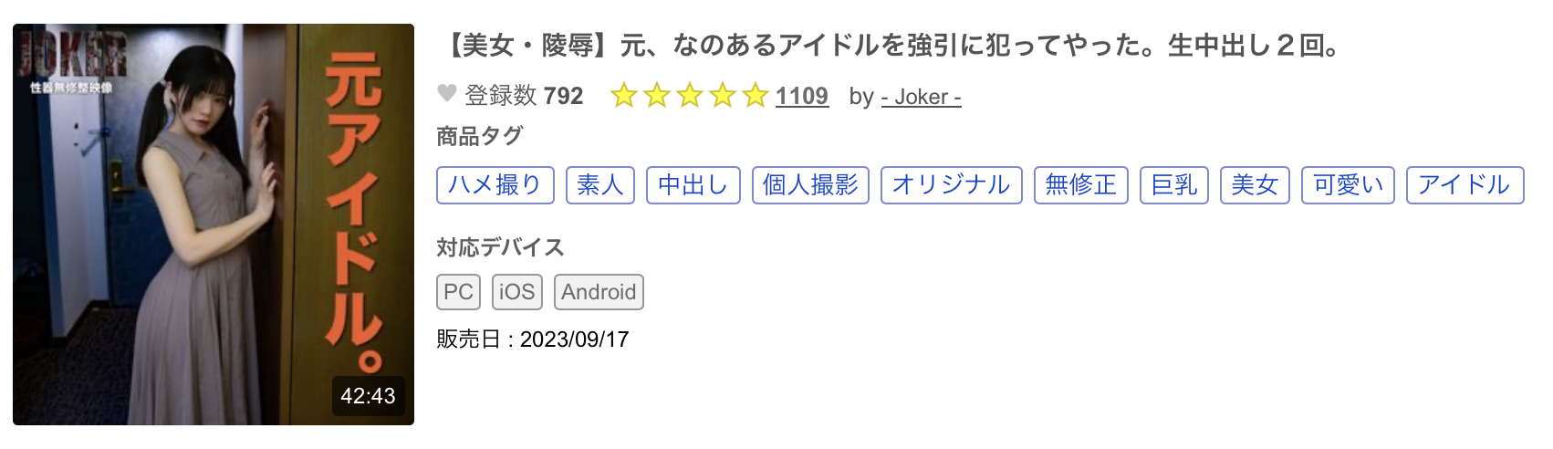 是的,又是FC2无码卖家的杰作,车牌是「fc2-ppv-3798238」,片名是「【美女・陵辱】元、なのあるアイドルを强引に犯ってやった。生中出し2回。」 :是的,如果你略懂日文的话,一定会看到アイドル(偶像)这个关键字,怎么样?你下半身的海绵宝宝有没有感受到神秘的力量?有没有长大成为30公分好棒棒?