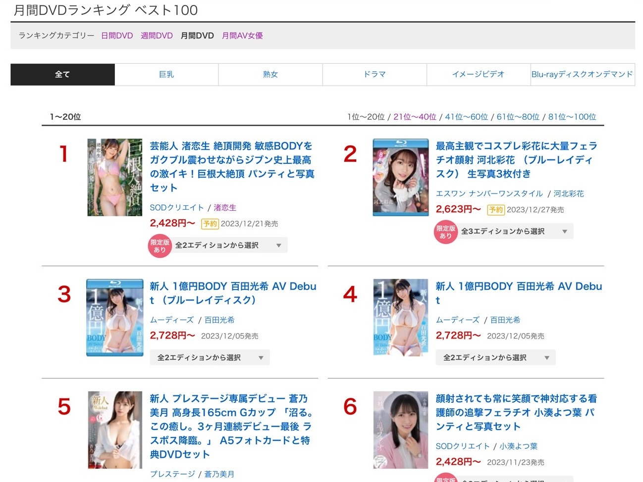 这个月的销售排行榜很重要,因为你知道的,12月向来是各片商精锐尽出的时候,别的不说好了,光看到沉默很久的蚊香社(Prestige)连续三个月推出新人然后把「最后的大魔王」苍乃美月放在12月出道以及熟女片商Madonna专属女优总动员去拍乱交巴士温泉祭就知道大家在打什么算盘了,所以拿下第一名的是ー