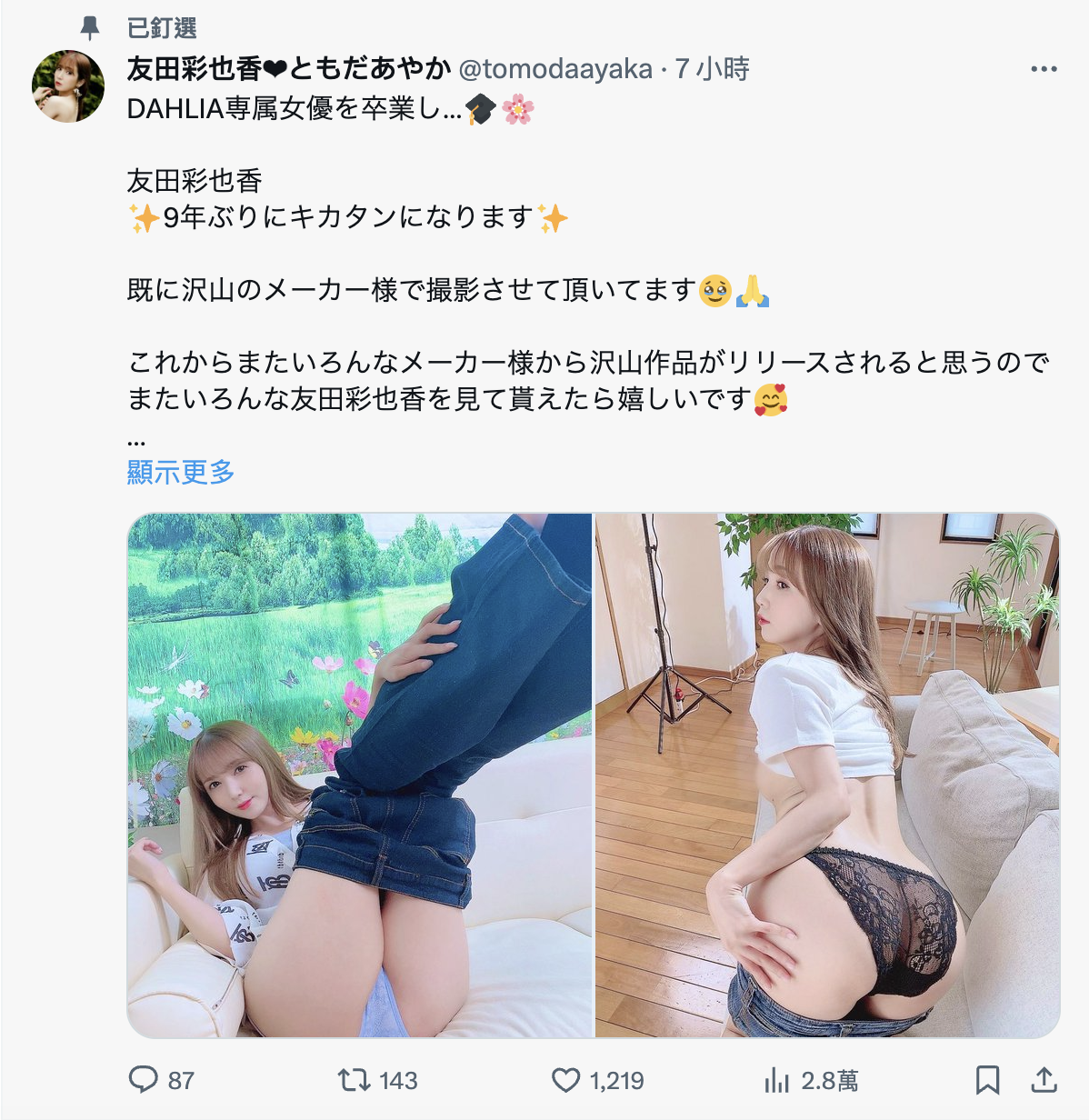意思就是,她,友田彩也香离开了待了四年的Faleno集团,我个人是觉得非常了不起—诚如我之前和某个网友在版面上讨论的,友田所属的Diaz Group集团几年来非常弱小,为了留住女优并且让她们待在最舒服的位置所以这家经纪公司真的过得很辛苦,对外他们想尽办法让女优待在片商当专属女优,对内他们给出业界最低的抽成,只是即便他们这么努力最后友田的专属女优还是没了⋯
