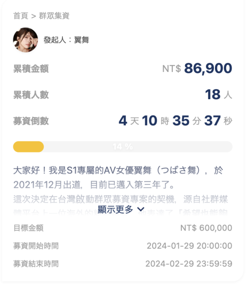 结果剩5天,总共募资86,900新台币,除非有几个超级有钱人把剩余的金额补足了不然这募资是很不妙的;从这个活动就知道エイトマン(8MAN)对海外其实兴趣不小,也做了市场调查派了颇有海外实力甚至之前也来过台湾旅卜卜木的つばさ舞(翼舞),但很明显的是他们错估了「来台湾」这事对影迷的吸引力,也大概没想到愿意付钱的粉丝这么少,那募资的金额连自我安慰说「只差一点点」都做不到⋯