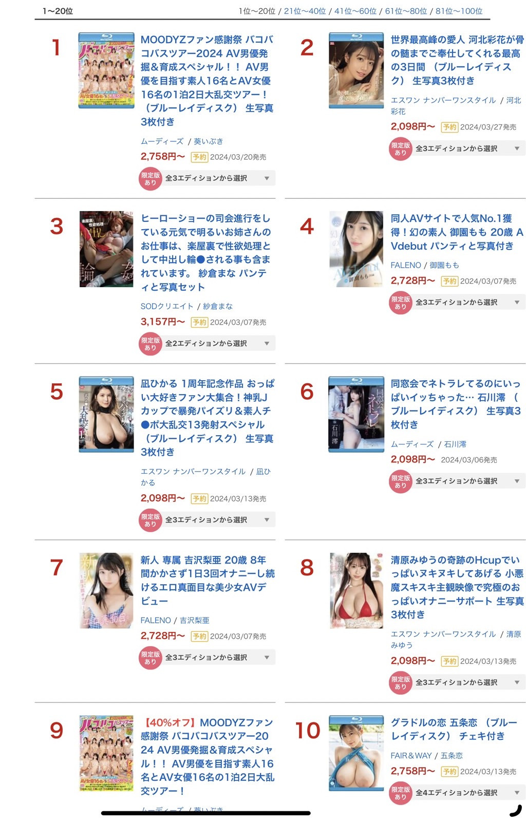 不过最重要的还是,她河北彩花啦,有她在没什么片子卖不出去的;第三名的作品「ヒーローショーの司会进行をしている元気で明るいお姊さんのお仕事は、楽屋里で性欲处理として中出し轮●される事も含まれています。」说明了纱仓まな(纱仓真菜)就是现代神兽,不管是艺能人还是超级新人又或者是谁通通都不是她的对手,她是名副其实的SOD一姐也是业界的指标;接着第四第七两位都是FALENO STAR的新人,虽然最近台湾女优那块碰到很大的麻烦,不过FALENO STAR的正规部队表现不错,在FANZA修改规则不得任意退片后两位新人「御园もも(御园桃)」和「吉沢梨亜」的成绩应该没什么灌水的成分,虽然不知道未来会怎样但至少是个好的开始;接着第五、第八、第十都是片商S1的大奶宝,凪ひかる(凪光)就算社群用得少但火力实在旺,清原みゆう(清原美优)我不只一次说过她就是S1的新神乳,至于第10名五条先生的作品并非AV而是写真,请大家务必记住这支作品,等等介绍销售排名的时候会用到〜
