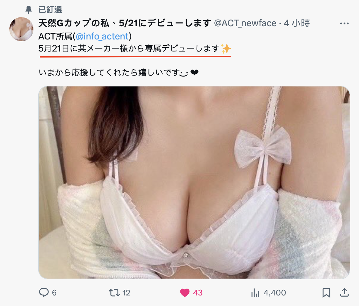 这么做有什么用意?首先当然是提前展开宣传,如果能在情报解禁前拿到5000-10000个追踪那就成功了,同样在出道作情报解禁前就有了X的春阳モカ(春阳萌花, https://twitter. com/haruhi__moka)于发片大爆发的同时有了超过6000个追踪就相当不错;再来,提前曝光新人的卖点,这位女优不用说,就是「天然Gカップ(天然G罩杯)」的大奶;最后也是最重要的是提前宣布自己的身份,她会在5月21日出道,而且,还是专属女优(専属デビュー):