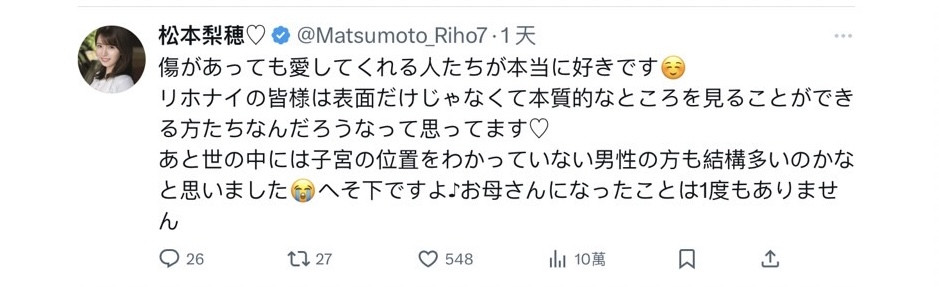 即将在台湾举办大尺见面会的松本梨穂(松本梨穗)是在X(https://x.com/Matsumoto_Riho7)针对身体上的伤疤做说明,虽然大家身上都难免有一些疤痕,不过松本的位置比较敏感一点,所以她是这么说的: