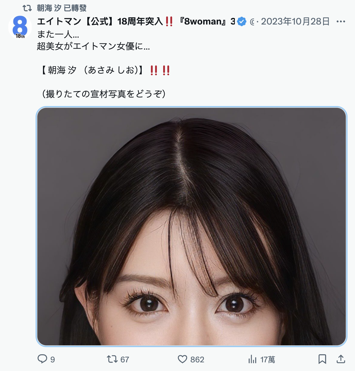 其实扣掉说不会拍片的女神ジュン(女神纯),エイトマン(8MAN)手上还是有一些值得期待的女优,比方说好久不见还被暗示7月会有动作只是后来删文假装没这回事的「星まりあ(星麻里亚)」、比方说奶那么大腿那么长即将展开AV人生第二章的「神木兰」,还有被很多人认为是暗黑子瑜的凤みゆ(凤美优)⋯写到这边不知道你注意到了吗?エイトマン(8MAN)这边受期待的女优不是片子发一发就卡住了就是从其他事务所挖角来的但休息了很久很久,不能说完全没有期待但她们就不会是那种片子一出就辗压所有人的超大型新人,所以朝海汐可以说是这家自称和最强事务所近期的希望所在,我很想知道她到底有多美?也很期待エイトマン(8MAN)会让她在哪一家片商出道?