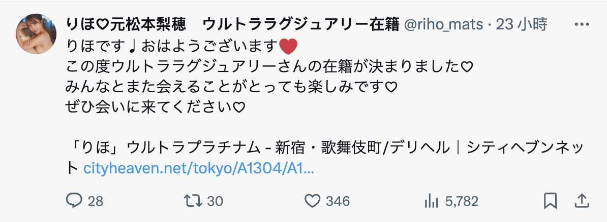 也就是说松本梨穂成了风俗妹,只要有办法你就可以叫她到房间来提供「性福」,不骗你,松本发完文章后好几个人写私讯问我怎么预约,真的是很有人气呢...