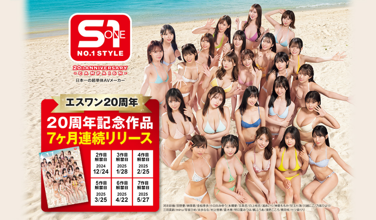 首先来看作品的部分:为了庆祝创业20周年就得来不易的成就,S1是一口气准备了七支作品,这支24位女优合作的超级企划是第一部,接下来12月24号,明年的1月28、2月25、3月25、4月22以及5月27日都会有作品上市,也就是说这个20周年庆将会有长达半年的庆祝活动ー至于那些庆祝创业20周年的特别企划我还不知道内容,但女优的部分我想在这半年间这家资源丰富的片商会一直补充新鲜的肉体,应该不会像Madonna一样要从其他片商找人用...