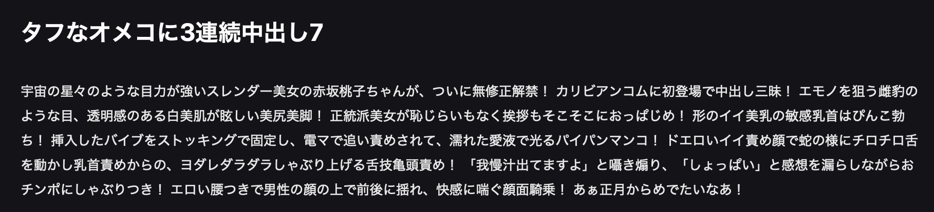 她的片子已经出了,番号是010125-001,从作品封面就可以知道她是无码片商カリビアンコム(加勒比)庆祝2025年元旦的新鲜鲍鱼,之所以能得到这个荣誉是因为这位女优不只是「无修正解禁(第一次下马)」,而且她还拥有透明感的美肌以及教科书的美尻美脚,所以最后カリビアンコム(加勒比)是这么形容这位赤坂桃子的: