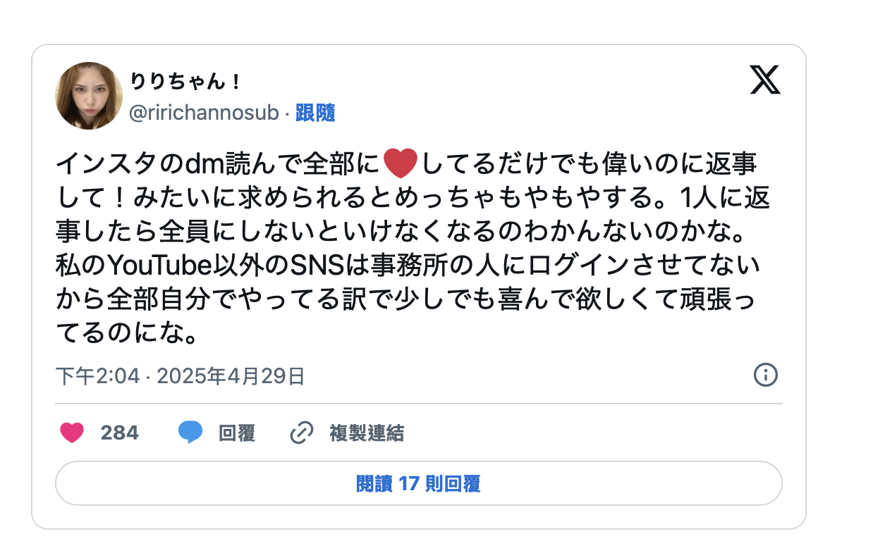 私讯一多,难免就会有些影迷让女优不太开心,就像才刚举办完台湾摄影会的七ツ森りり(七森莉莉)就在自己X的小号(https://x.com/ririchannosub)发牢骚,不是因为收到露鸡鸡的不雅照,而是ー