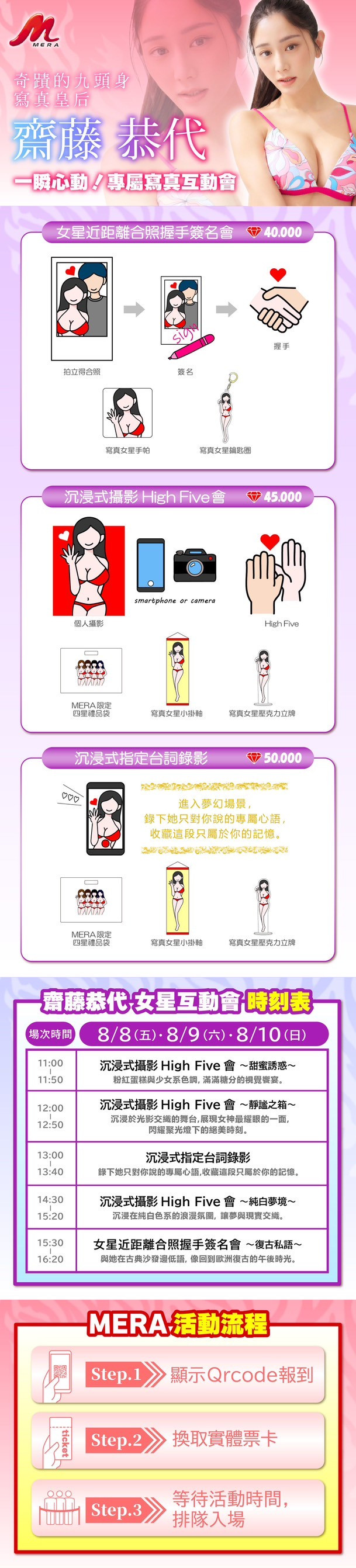 这阵容真的有点夸张,就算不追写真业界、你也应该在社群的推荐名单看过这些名字,在8月8日到10日她们就要活生生地出现在大家面前;而且MERA超有诚意的,除了高手如云外也有诚意满满的互动以及制作精美的商品,请大家参考图㸠说明,马上去JKFACE预约: