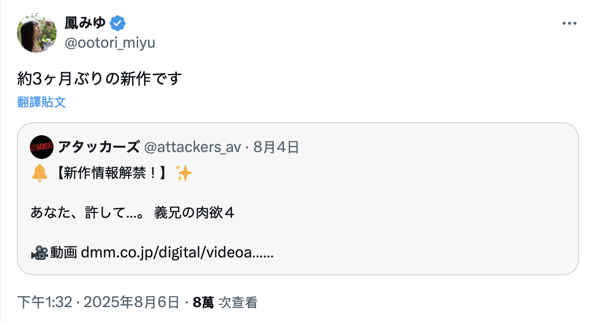 最后,还是那句老话,在エイトマン(8man)这间事务所,女优如果没有在大型片间拿到专属合约那是很危险的,神木兰虽然是出道满3年引退,但在离开Faleno Star后就休息了很长一阵子才继续发片,但因为拿到的不是专属合约所以发片断断续续很不稳定,最后就找到了想做的事情引退;同样的状况也出现在这间经纪公司的另外一位女优「凤みゆ(凤美优)」身上,9月在アタッカーズ(Attackers)的作品「あなた、许して…。 义兄の肉欲4」就她本人的说法是睽违3个月的新作品,她条件不好吗?暗黑子瑜当然没有什么好挑剔的,但这样的她因为没有片商的专属合约导致发现很不稳定,除非是本人不想拍片或是有其他的赚钱管道(这个很多人知道,这边我不多说),不然光做AV女优,凤みゆ(凤美优)大概要饿死了⋯