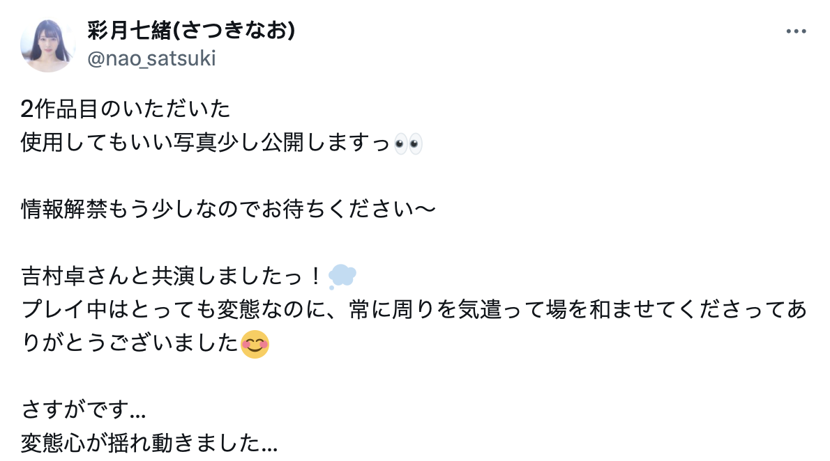 所以吉村大叔又吃到好粿了,从宣传影片可以看到他非常努力,不只用力舔拼命亲然后自创的吉村式体位连发,最后发射时的嘶吼声也听得出是有感情的,让号称是「人生第一次被男人中出」的彩月七绪爽到骨子里,说无套的男优让她快乐似神仙~