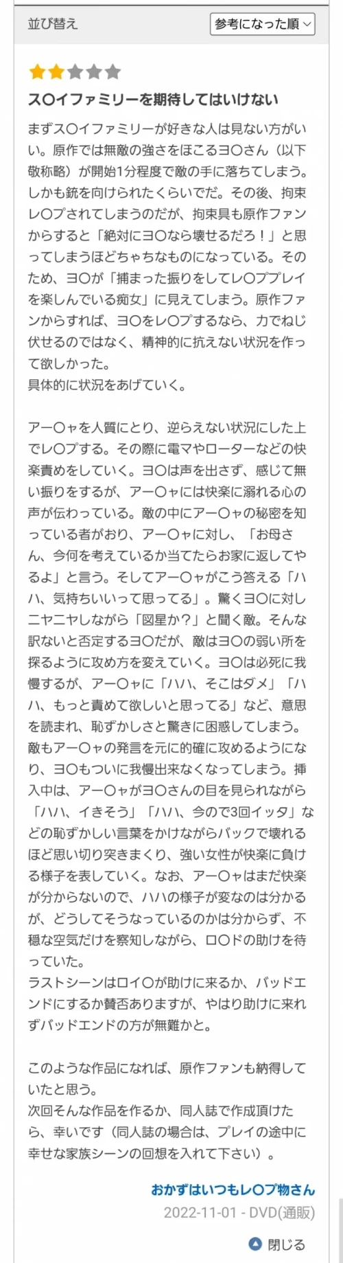 看看人家留的言,标题直接就讲了「ス〇イファミリーを期待してはいけない(喜欢间䜓家家酒的影迷千万别指望这支作品)」,因为在片中无敌的ヨル(约儿)不到一分钟就被撂倒然后上刑具开始凌辱ー留言的粉丝说,ヨル(约儿)在原作中实在太强太强了,但在片中被枪一指然后一个手刀就被打晕任人干,看起来就像是个故意被抓想吃棒子的荡妇⋯