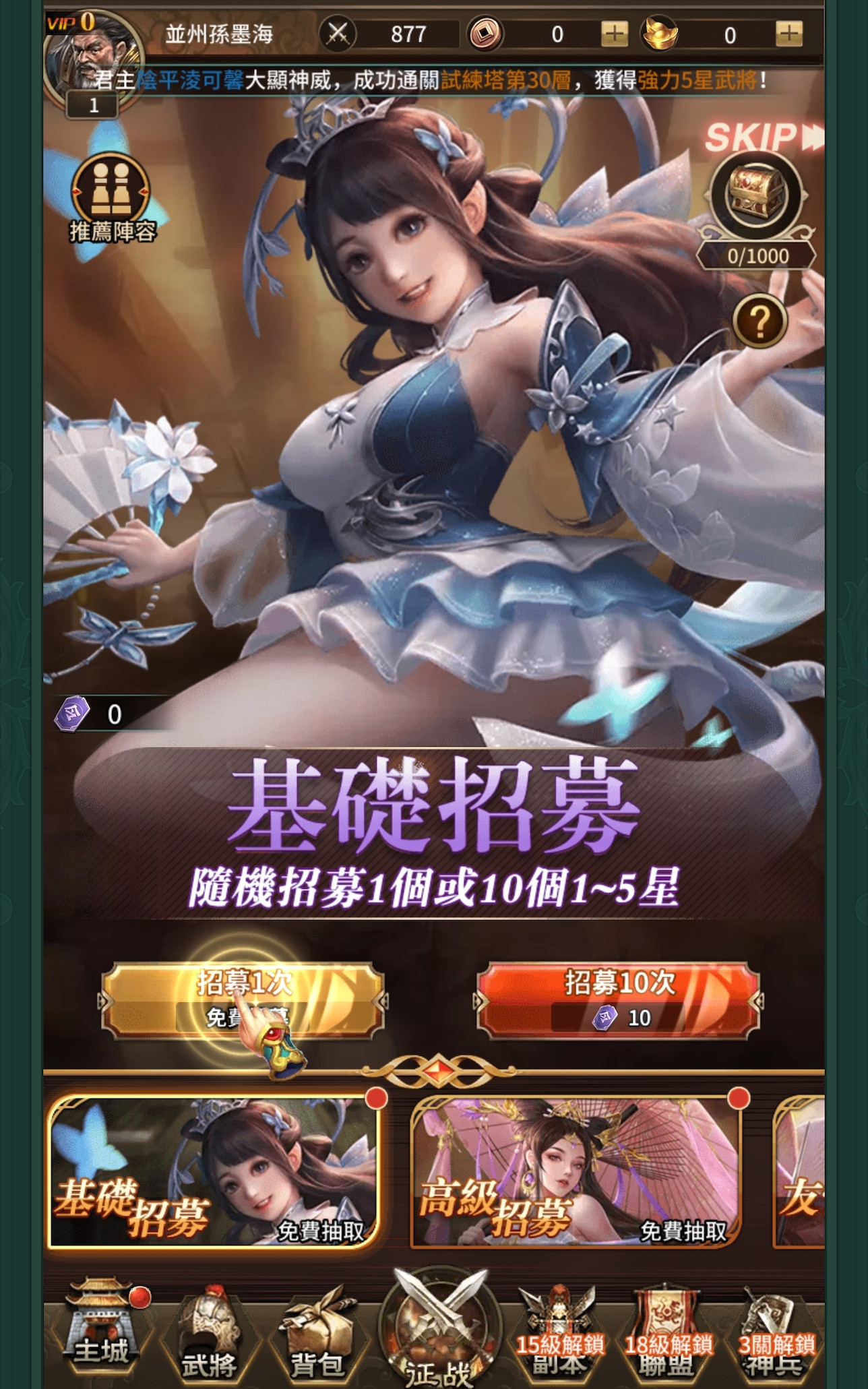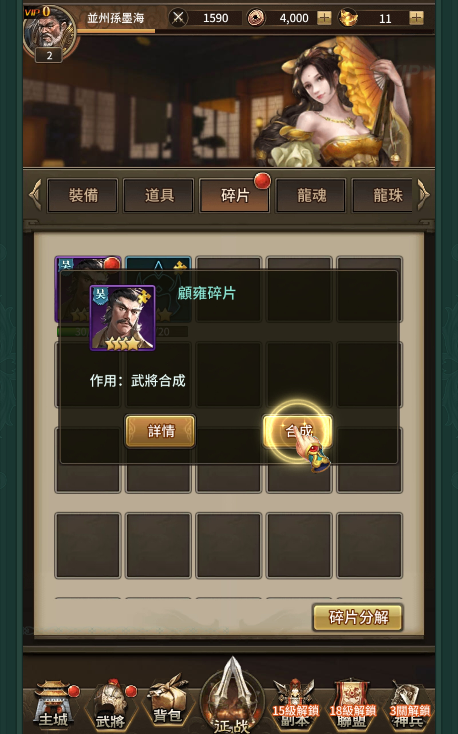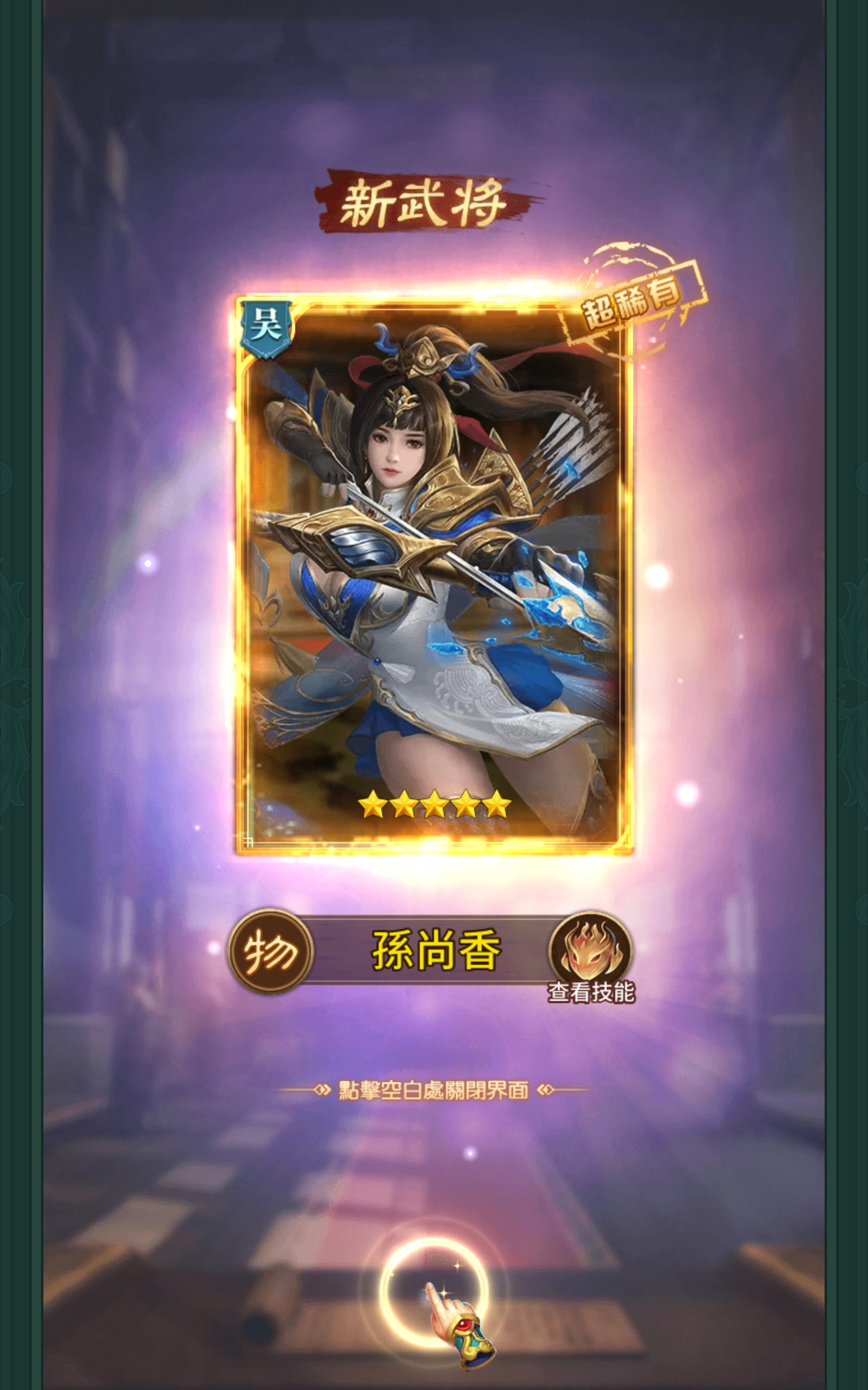 然后就开始打架了,淫游三国就是很一般的挂机游戏,你一个人不够就要多找几个人打架,每天都可以一般抽奖有机会有也可以大抽一把,然后我就得到了孙尚香: