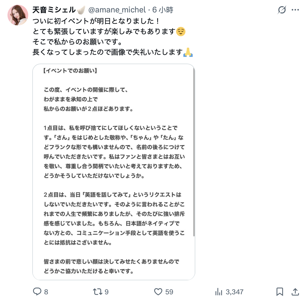 再来,活动当天请不要跟她说「讲几句英文来听听」,天音ミシェル(天音蜜雪儿)说,在人生中,很多人看到她混血的外型就提出这样的要求,每一次都让她感觉非常不舒服;当然,如果不是以日文为母语,天音ミシェル(天音蜜雪儿)说自己很乐意用英文来conversation,但如果你是日本人的话,明明可以用日语沟通,就不要叫她speak English了⋯