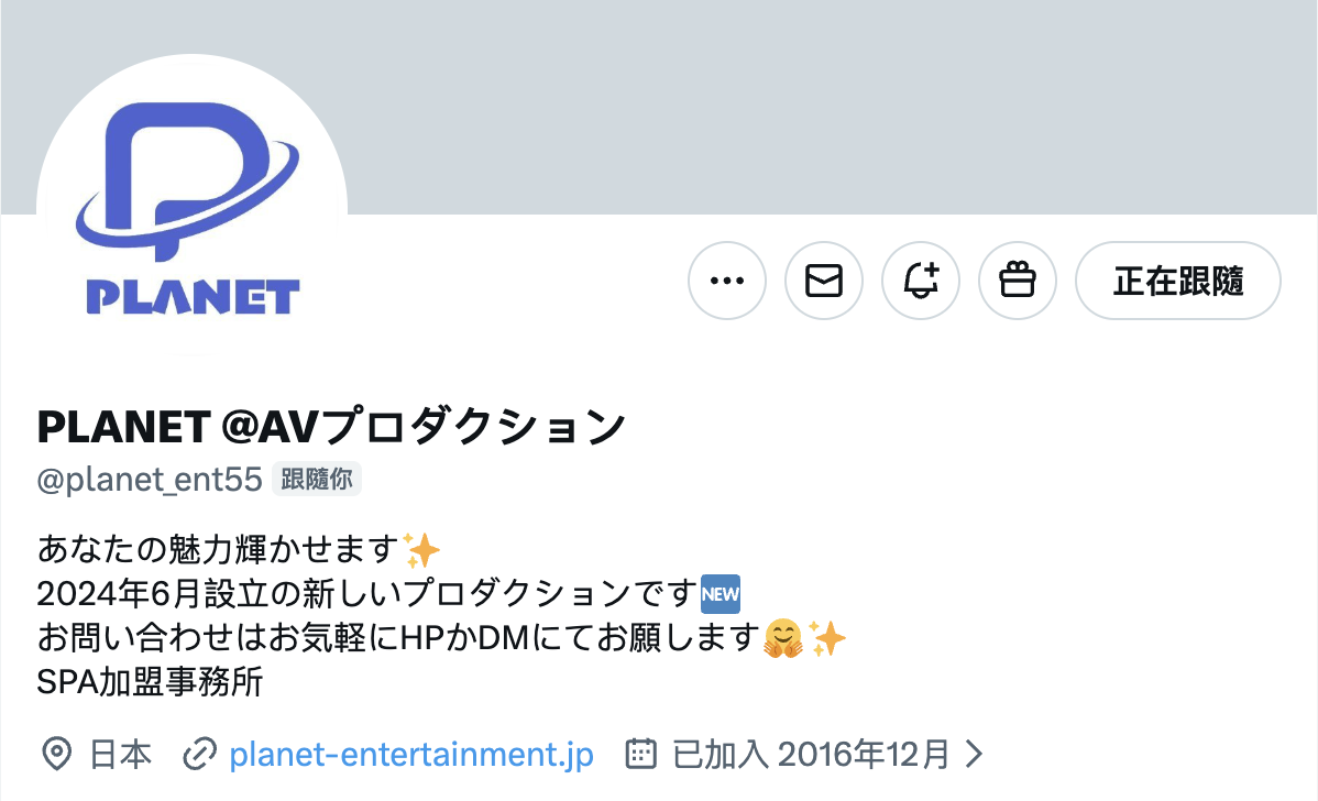 因为可以确定她的新东家是哪一间事务所了:从她X帐号(https://x.com/Yzo2tGbn6971949)的追踪名单可以发现「PLANET」这家经纪公司,双方不但互相追踪而且这家经纪公司也会转推她的发文,以业界女优和经纪公司合作的状况来讲一定是确定了合作关系,也就是说不再是设楽ゆうひ(设乐夕日)的她update成了这家经纪公司的新战力,完全复活指日可待: